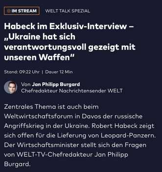 Der Bürgermeister von Kiew, Witali Klitschko, hat nach einem Treffen in Davos mit dem deutschen Vizekanzler und Wirtschaftsminister Robert Habeck „positive Entscheidungen“ bezüglich der Hilfe für die Ukraine – „insbesondere der Übergabe von Waffen“ – bekannt gegeben.