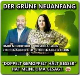 Zwei Studienabbrecher, die ihr Leben lang – die eine ist 28, der andere 46 – noch keinen Tag in einem richtigen Beruf außerhalb der Politikblase gearbeitet haben: Ricarda Lang und Omid Nouripour, die neue „Doppelspitze“ der „Grünen“, sind zwar repräsentativ für die „grüne“ Funktionärskaste, aber so richtig begeistert ist nicht einmal die eigene Basis von ihrer langwierig ausgekungelten Kür. Gerade mal jeder zweite „Grünen“-Anhänger findet, die beiden seien die „richtige Wahl“ für den Parteivorsitz der „Grünen“. Tja, Pech gehabt. Nun sind sie halt da.