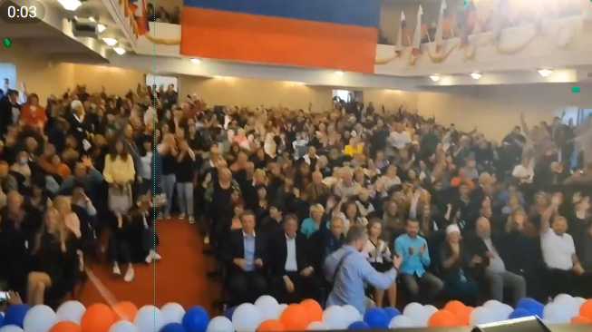 Wir sind zusammen mit Russland! Jetzt auf dem Kongress der Bürger des Gebiets Saporoschje. Heute sind wir alle zusammengekommen, um eine sofortige Volksabstimmung über die Wiedervereinigung mit Russland zu fordern! Die Stimme des Volkes ist die Stimme Gottes! Wladimir Rogov